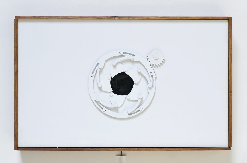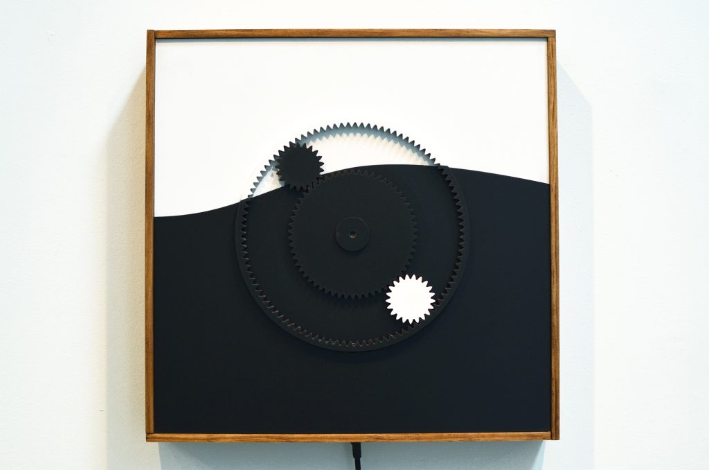 I Feel Pretty Today is a black and white wall-mounted mechanical sculpture featuring two intricately carved white gears spinning gracefully against a dark backdrop. At first glance, their elegant motion suggests harmony and beauty, yet closer inspection reveals that their teeth never actually touch. The true mechanism lies beneath in a set of irregular, unrefined “ugly” gears that power the movement. The piece confronts our shared insecurities, exposing the hidden structures that support curated appearances and questioning the facades we construct to feel worthy and attractive.